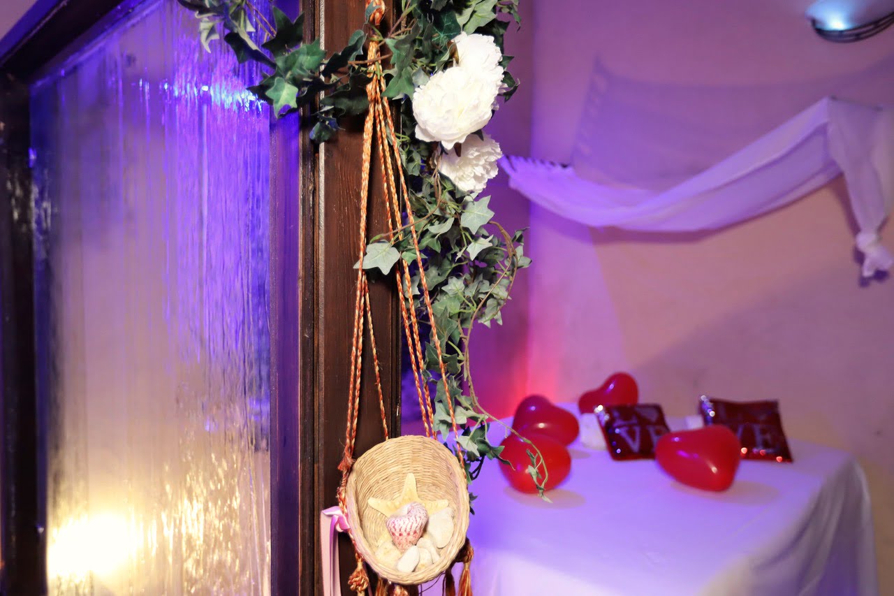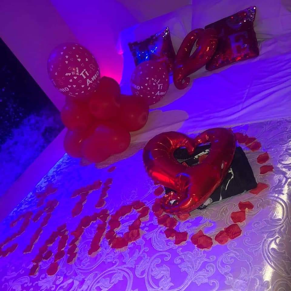 Les décorations comprennent des ballons, des pétales, des coussins personnalisables, des lumières douces et des bougies.